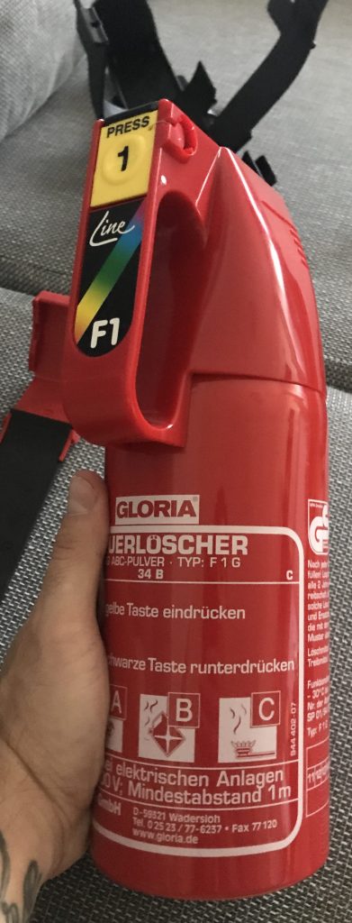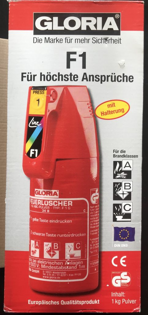 El extintor es de la marca germana Gloria y, por lo que estuve indagando, fue el proveedor que suministraba los extintores a Mercedes. Si no adquirí el extintor en la Mercedes fue porque costaba tres veces más que comprándolo en otra tienda.